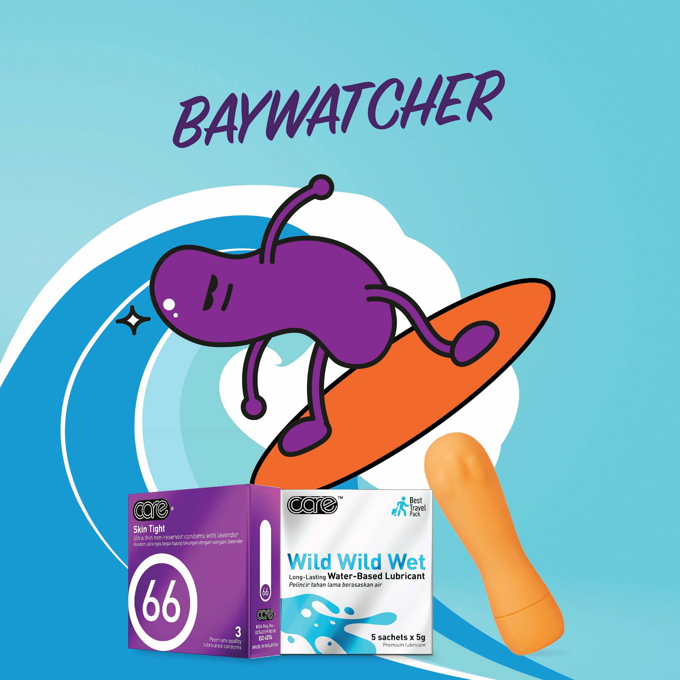 Alongside Wild Wild Wet, our water-based lubricant, and Care 66, you’ll enjoy a skin-tight suit as you surf through the turbulent waters of love.